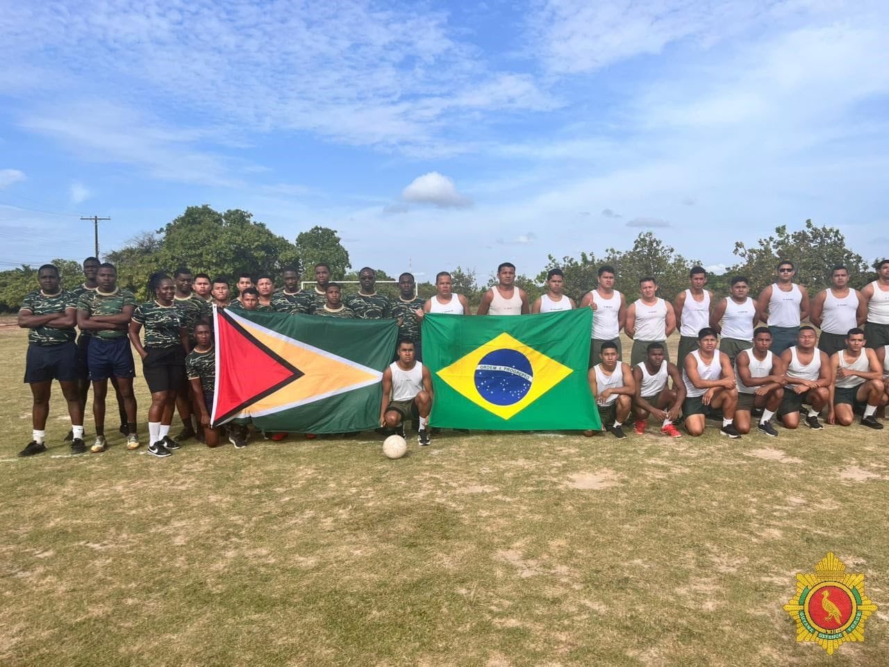 Ranks of the 3 Infantry Battalion, based at Lethem, Region 9, participated in a friendly football match with members of the Brazilian Armed Forces on Friday, October 31, 2025, at the Frontier Platoon Base of the 1st Infantry Jungle Brigade in Bon Fim, Brazil.